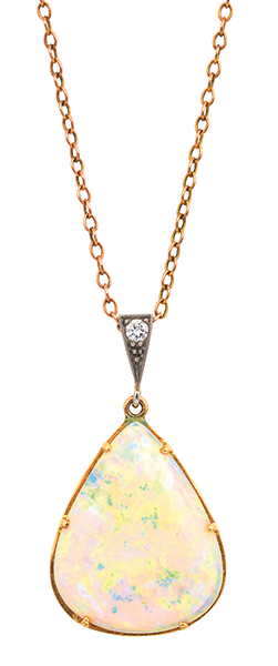 The pear shaped solid white opal cut en cabochon displaying good play of colour, suspended from a diamond set bale, to a trace chain, mounted in gold, total length 420mm.