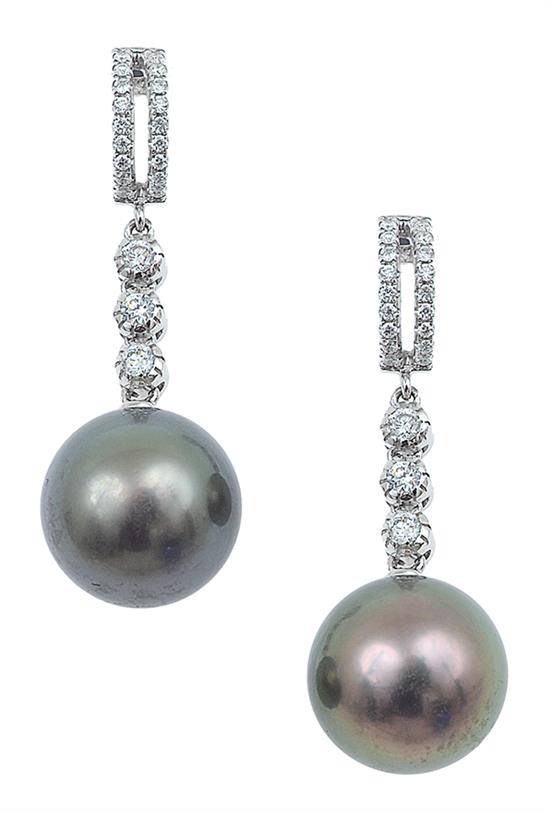 A PAIR OF TAHITIAN PEARL AND DIAMOND EARRINGS