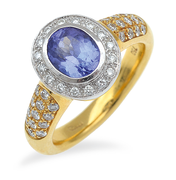 Centrally set with an oval cut tanzanite of 2.14cts, surrounded by round brilliant cut diamonds, mounted in 18ct gold, ring size R.