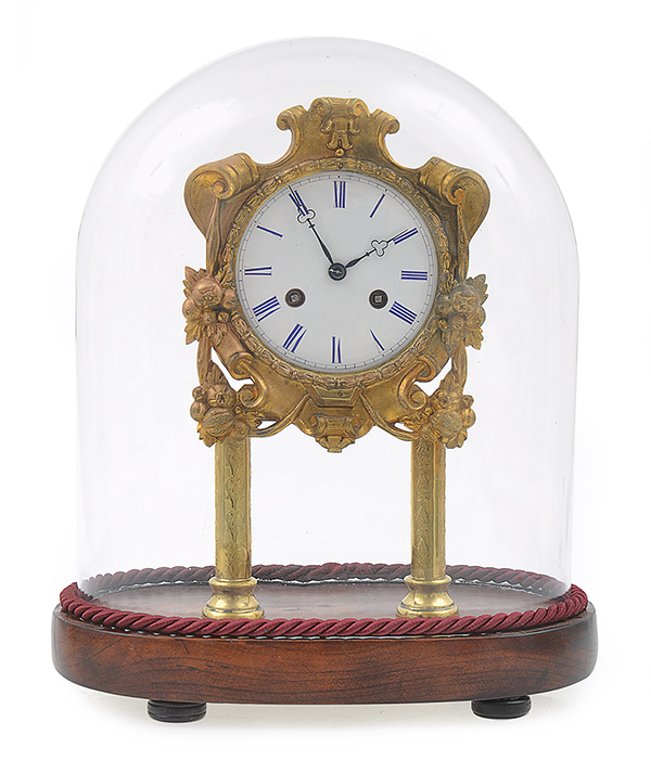 on wooden base with glass dome, circular enamelled Roman numeral dial framed by a gilt metal cartouche decoration, total height 34cm