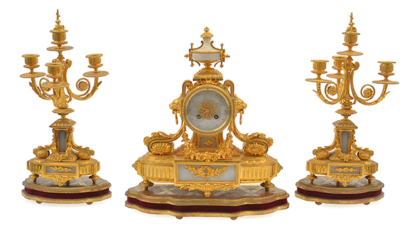 an elaborate three piece onyx inset garniture, in the neo classical style, all pieces seated on wooden stands, 41cm high