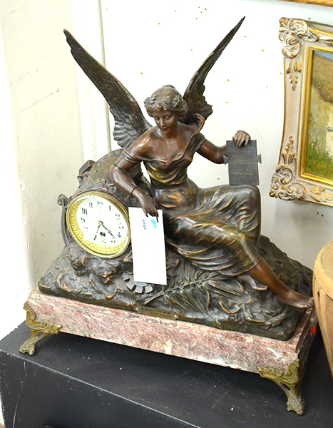 A FRENCH SPELTER AND MARBLE MANTEL CLOCK