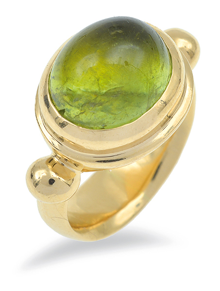 The oval green tourmaline cut en cabochon, horizontally mounted in a heavy frame of 14ct gold, ring size O-P.