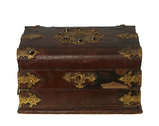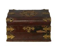 A 19TH CENTURY MOROCCAN LEATHER, GILT BRONZE AND CABOCHON MOUNTED WRITING BOX, BY AUGUST KLEIN VIENNA
