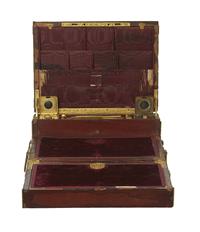 With silk lined and gilt bronze fitted interior, the fall front box revealing velvet lined slope, stationary racks, panel with three frames, inc wells and gilded accoutrement.
