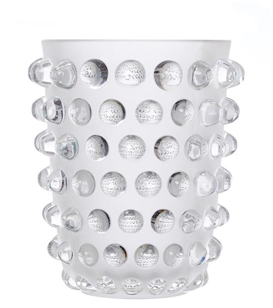 Of flared cylindrical form with rows of roundels on a frosted glass ground, incised to the base Lalique France, 20.5cm high.
