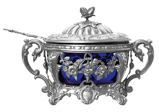 With acanthus scroll moulded handles and mounts interspersed with open work panels of flowers and cartouche, the lobed domed cover with fruit and foliate finial, silver weight 380 grams, 21cm width.