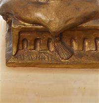 Depicting a seated figure in eastern dress sitting cross legged on a cushion and stool with hookah, engraved signature, 7.5cm high (including marble plinth).