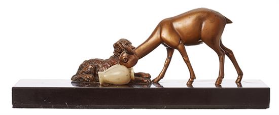 Depicting a deer drinking from a broken pitcher with nestled spaniel at its feet, set upon a black marble base, 39.5cm x 11cm x 16.5cm.