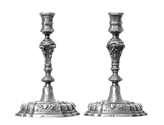 Finely cast in the Regency manner, the octagon sconces above baluster support with applied cherub masks and mermaid figures, the concentric stepped base with embossed floral and fruit panels, chassed throughout, hallmarked MP, probably provincial German silver, weight 563 grams.