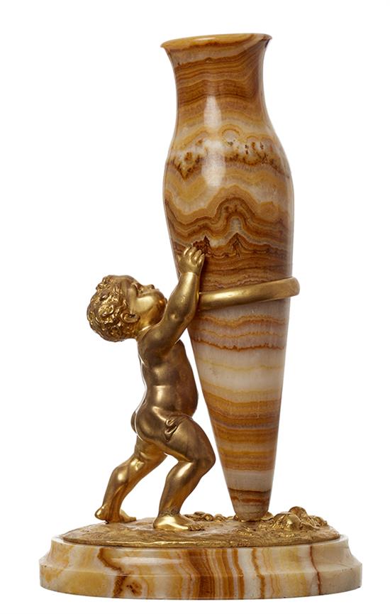 The urn form agate vase supported by putto with outstretched arms above leaf and berry moulded platform on stepped agate plinth, 25cm high.