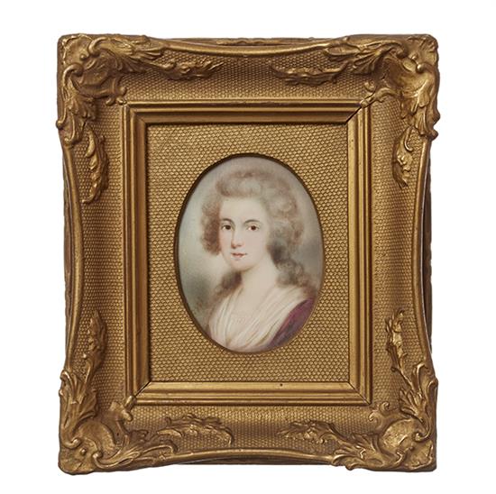 Depicting a lady, within a gilded frame and mount, 8cm oval, the frame 15cm x 17cm.
