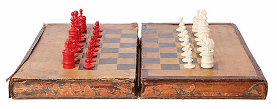 A VICTORIAN CHESS AND BACKGAMMON FAUX BOOK GAMES BOARD, CONTAINING SETS AND SHAKERS, CIRCA 1850
