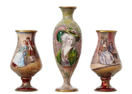 THREE LIMOGES 19TH CENTURY ENAMEL VASES, SIGNED