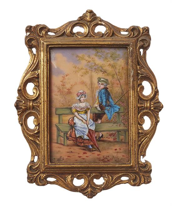 Depicting gallant and lady resting on a rustic bench within a landscape, in gilt timber frame, 11cm x 16cm (within frame).