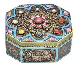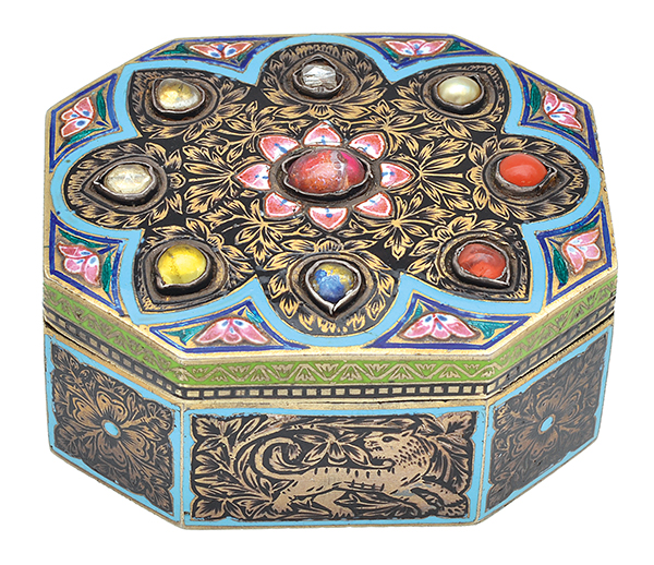 of octagonal form with hinged cover, set with foil backed diamond, sapphire and other semi precious stones, having finely detailed enamel in hues of black, gold, blue, pink, green and white, total length 550mm, 19th century.
