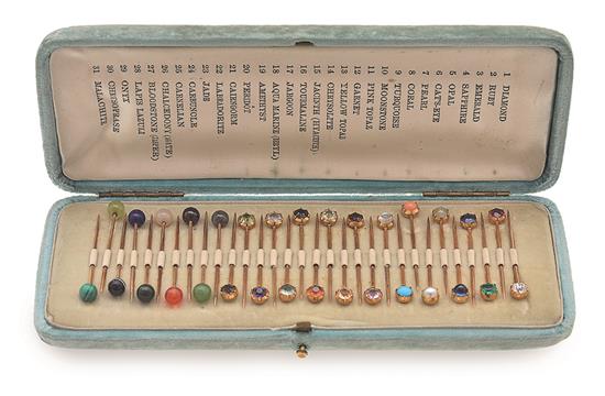 Comprising thirty one precious and semi precious stone set pins, mounted in 18ct gold, presented in original fitted box with names of the corresponding gems on the velvet inner lining.