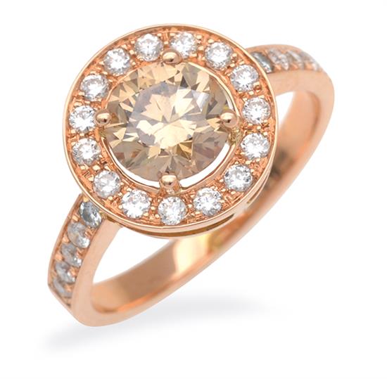Centrally set with a round brilliant cut champagne diamond of 1.29cts, surrounded by a halo of round brilliant cut diamonds, mounted in 18ct rose gold, ring size M.