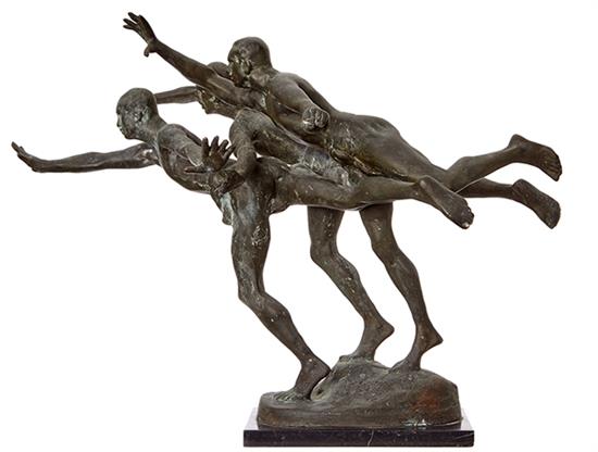 Depicting three athletes in dynamic pose, thrusting forward with outstretched arms, 48cm high including marble plinth.