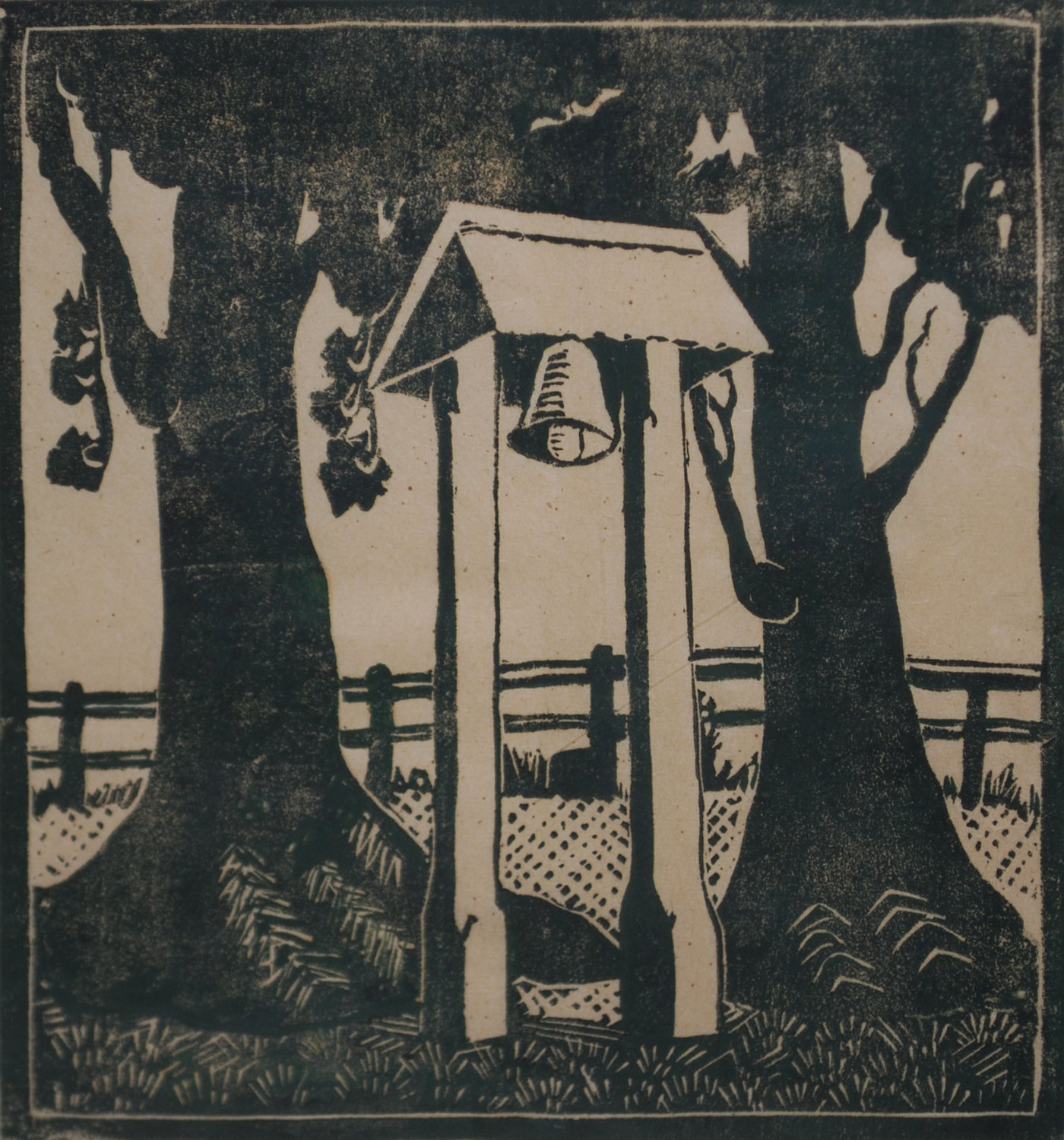 LISETTE KOHLHAGEN (1890-1969), THE OLD CHURCH BELL 1936-38, LINOCUT, 23 x 21cm
