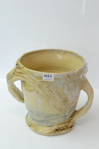 designed in the windswept tree motif ending in two trunk formed handles, signed and dated 1945, 18cm high, 16.4cm diameter