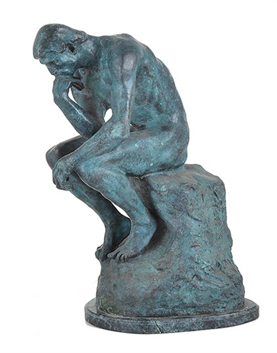 A LARGE EARLY 20TH CENTURY VERDIGRIS PATINATED BRONZE FIGURE, 'LE PENSEUR' 'THE THINKER' AFTER AUGUSTE RODIN (1840-1917)