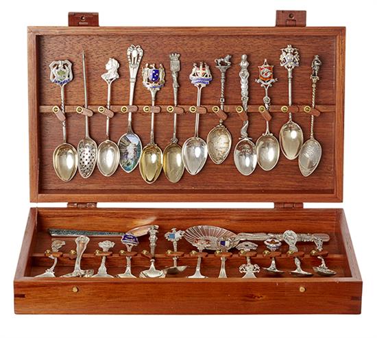 Comprising continental and British souvenier spoons, an 18th century mote spoon, a sugar sifter Birmingham 1911 by Conelius Saunders & Francis Shepard, Japanese silver Geisha and parasol form spoon and many others, housed in custom made case. Comprehensive listing available, total weight 388 grams, (26).
