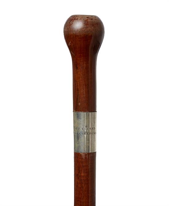 With bulbous handle with initialled JCB silver roundel, the upper shaft with inscribed silver band 'Queensland Gutta Percha' tapered with silver ferrule, 91cm long.