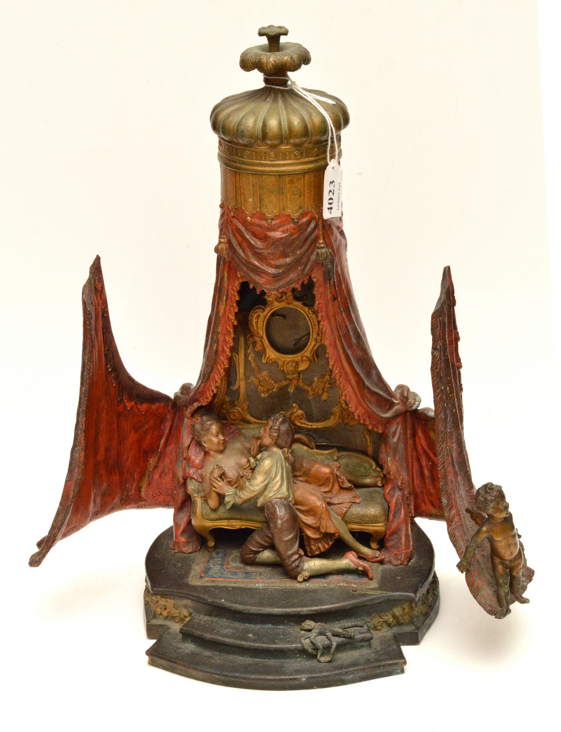 a cold painted bronze figural lamp base revealing courting scene, signed to the reverse, 'Namgreb', (the inversion of 'Bergman'), also marked with the letter 'B' within an urn cartouche, retailers plaque Nissel & Sikora, Wien' applied to base, 33cm high