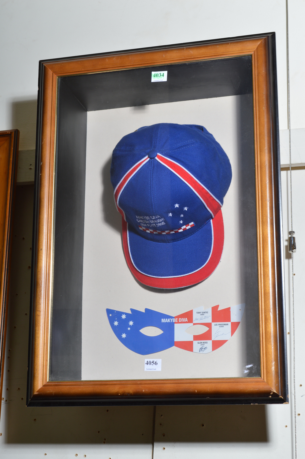 A MAKYBE DIVA JOCKEY CAP AUTOGRAPHED BY JOCKEY; FRAMED MAKYBE DIVA MELBOURNE CUP PRINT WITH AUTOGRAPH