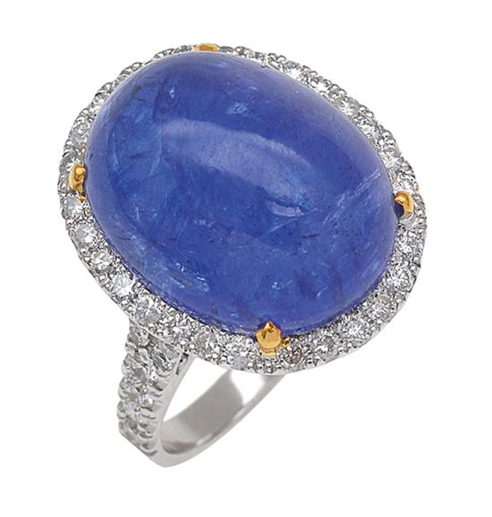 Centrally set with an oval tanzanite cut en cabochon, surrounded by round brilliant cut diamonds, mounted in 18ct white gold, ring size L.