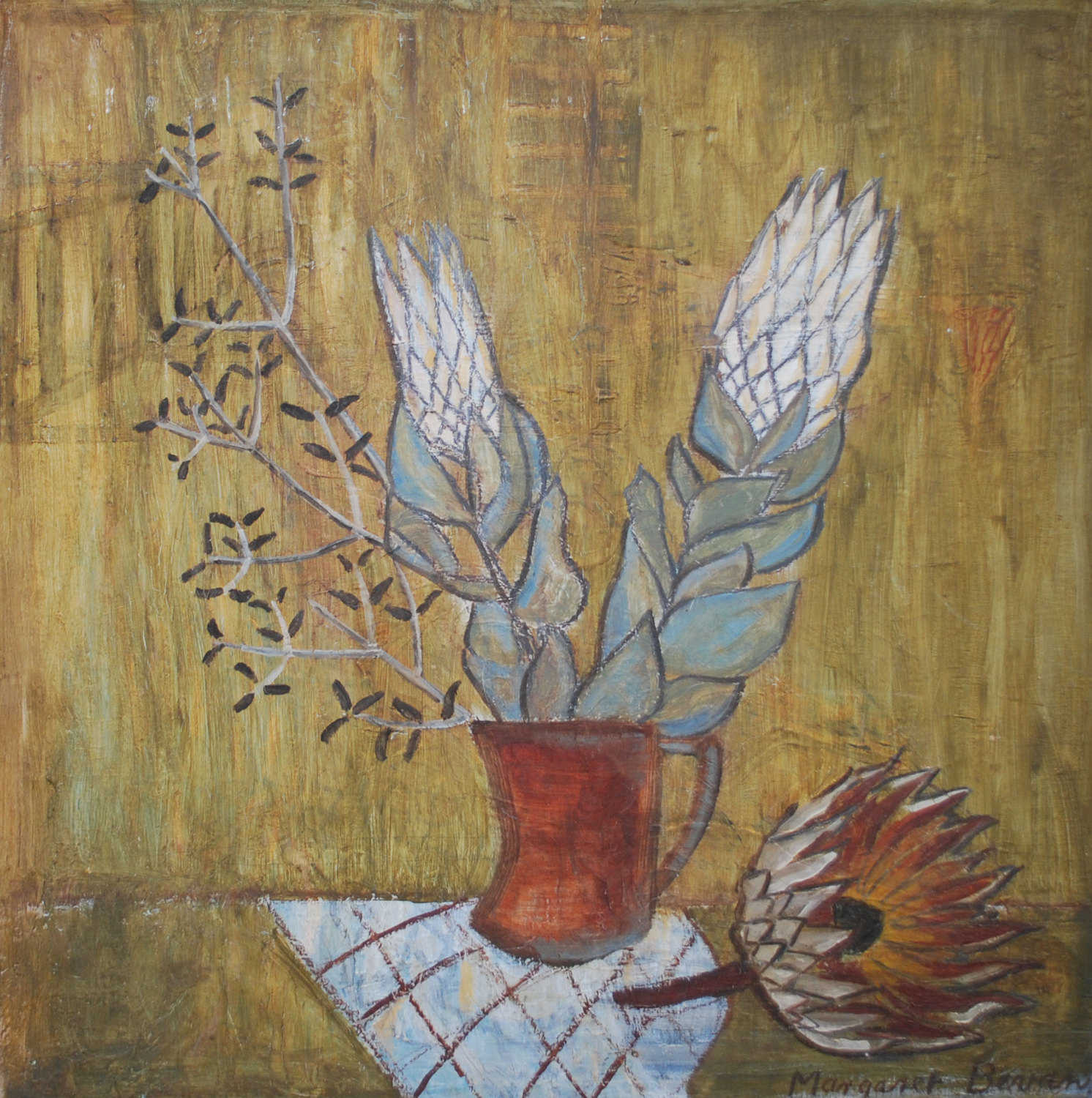 MARGARET BEVAN (1913 -), STILL LIFE WITH PROTEAS, MIXED MEDIA ON BOARD, 80 X 75CM