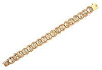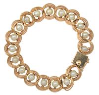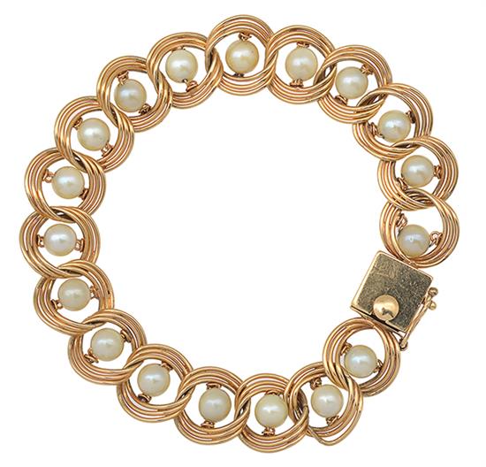 Comprising eighteen round cultured pearls measuring 5.30mm, framed in reeded circular links, mounted in 14ct gold, total length 190mm.