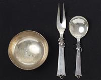 AN ENGLISH SILVER NURSERY RHYME BOWL BY MAPPIN AND WEBB, TOGETHER WITH A DANISH SILVER SERVING SET BY COHR