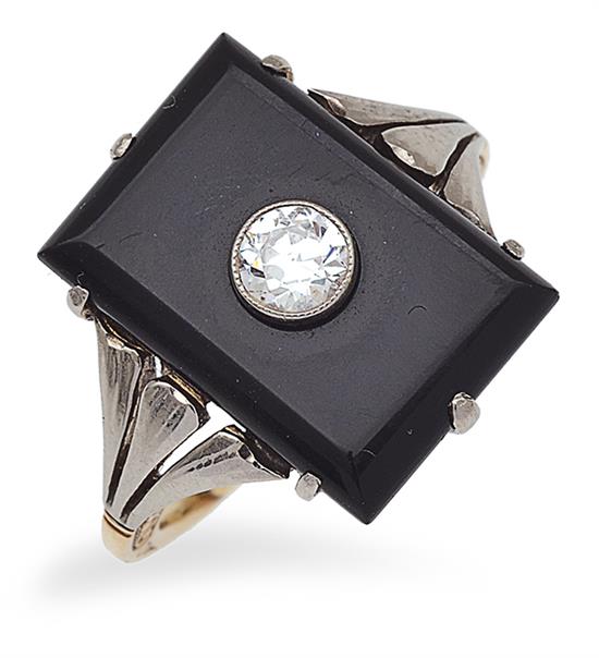 AN ART DECO ONYX AND DIAMOND PLAQUE RING