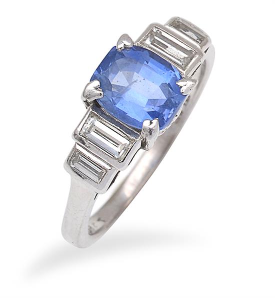 Centrally set with an oval cut sapphire of 1.47cts, flanked by graduated baguette cut diamonds, mounted in platinum, ring size K.