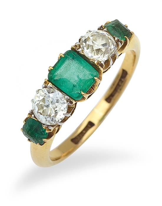 Centrally set with a cushion cut emerald of 0.39cts, flanked by old European cut diamonds and emeralds, mounted in 18ct gold, ring size J.