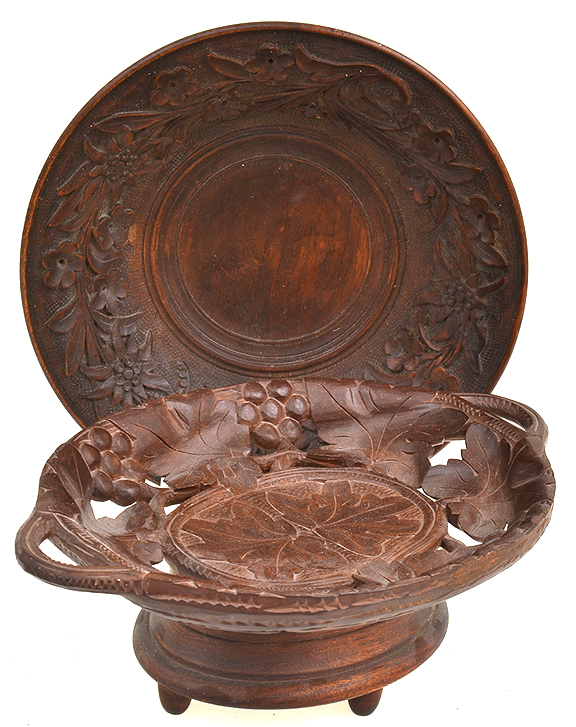 TWO CARVED WALNUT MUSICAL FRUIT BOWLS