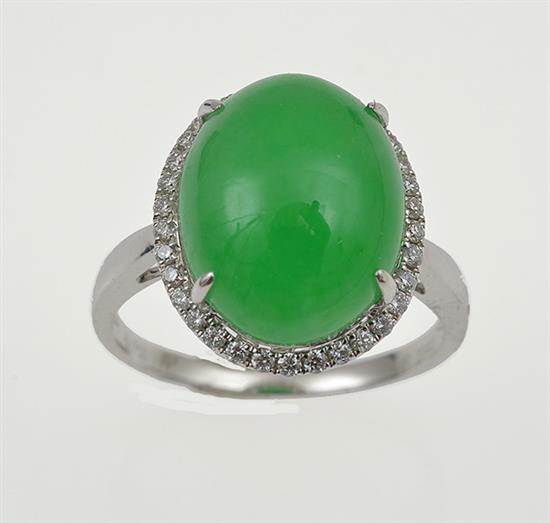 The oval jadeite cut en cabochon, surrounded by round brilliant cut diamonds, set in 18ct white gold, ring size L.