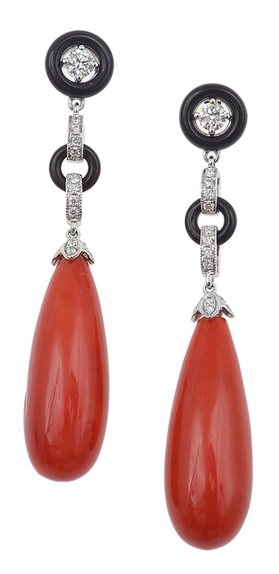 A PAIR OF CORAL, ONYX AND DIAMOND DROP EARRINGS