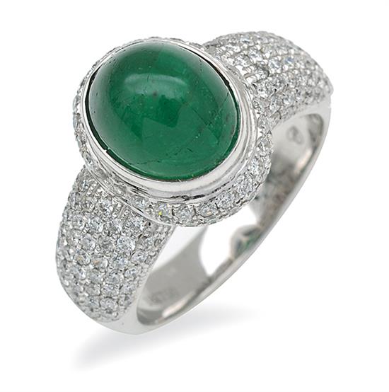 The oval emerald cut en cabochon surrounded by pave set diamonds, ring size M.