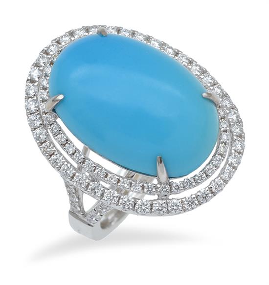 The oval turquoise cut en cabochon, surrounded by a double row of round brilliant cut diamonds, mounted in 18ct white gold, ring size M.