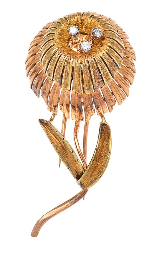 Modelled as flower, having three round brilliant cut diamonds set to the centre en tremblant, mounted in 18ct rose and yellow gold.