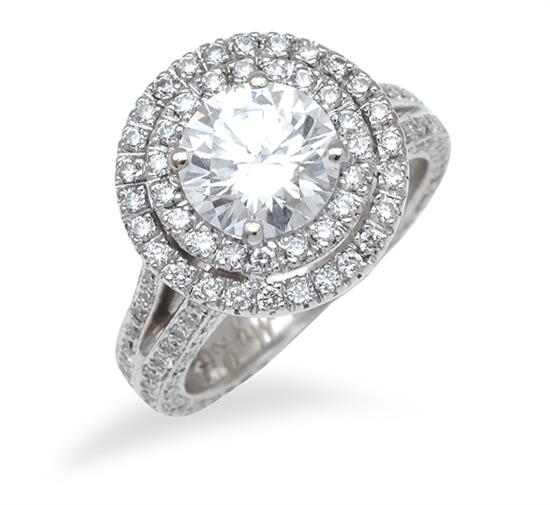 The round brilliant cut diamond of 1.72cts, surrounded by further diamonds totalling 1.15cts, mounted in 18ct white gold, ring size J, accompanied by a GIA report stating colour F and clarity SI2.