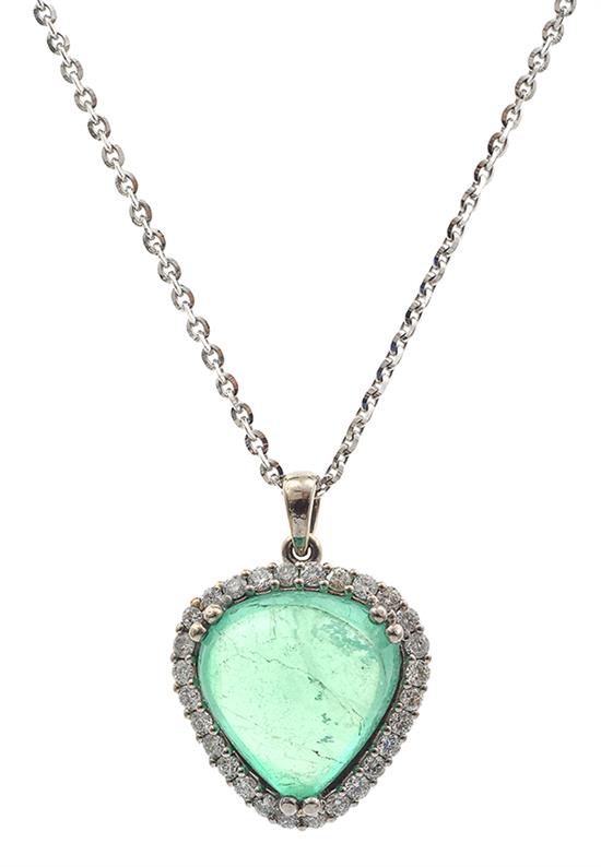 Centrally set with a pear cut emerald cut en cabochon of 16.3cts, surrounded by round brilliant cut diamonds totalling 1.40cts, suspended from a trace chain, all in 18ct white gold.