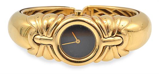 Quartz movement, black circular dial, signed case, dial and movement, 18ct gold stylised case and bracelet bands, 18mm diameter.