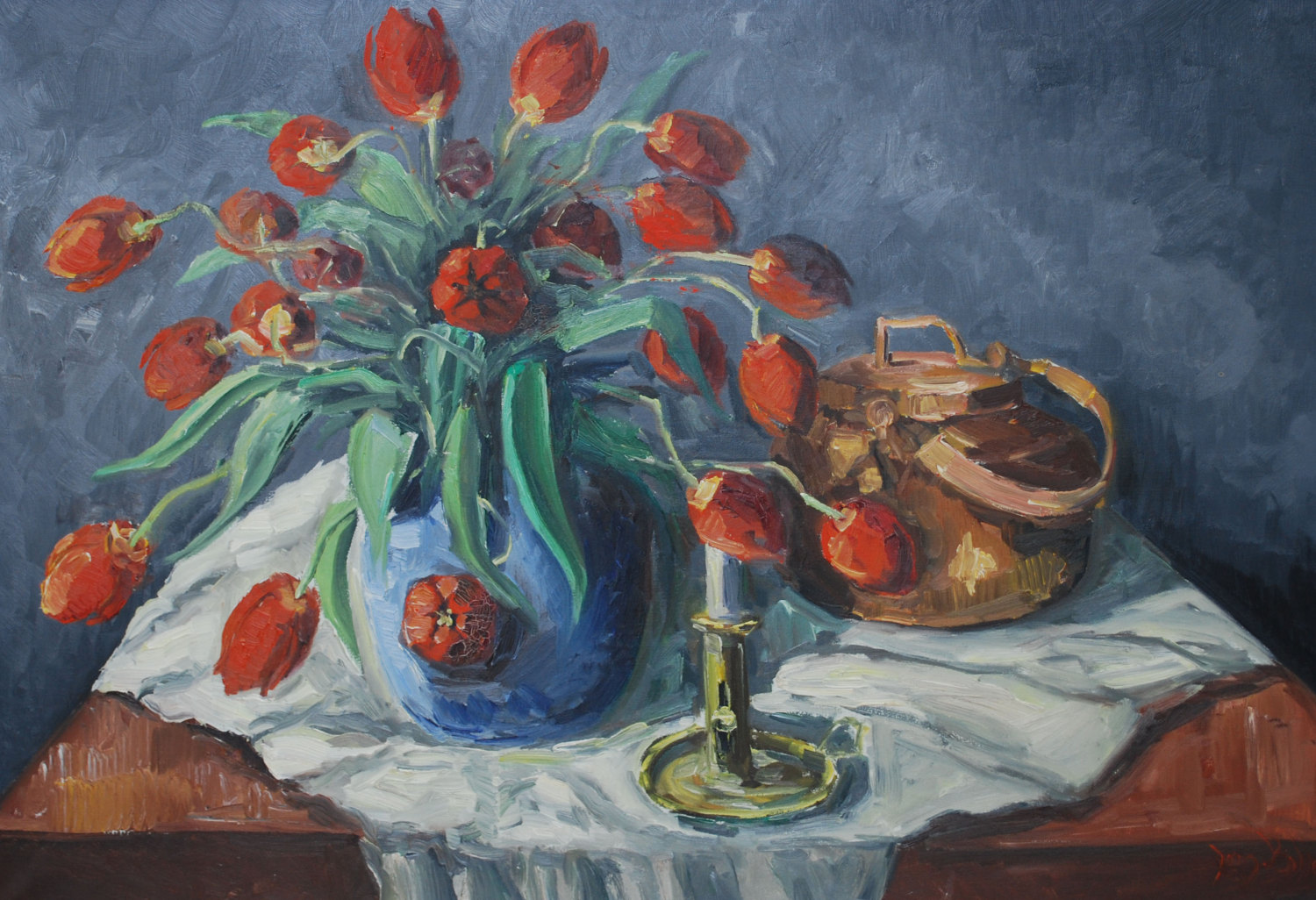JORG BILLE, STILL LIFE WITH TULIPS, OIL ON CANVAS, 65 X 95CM