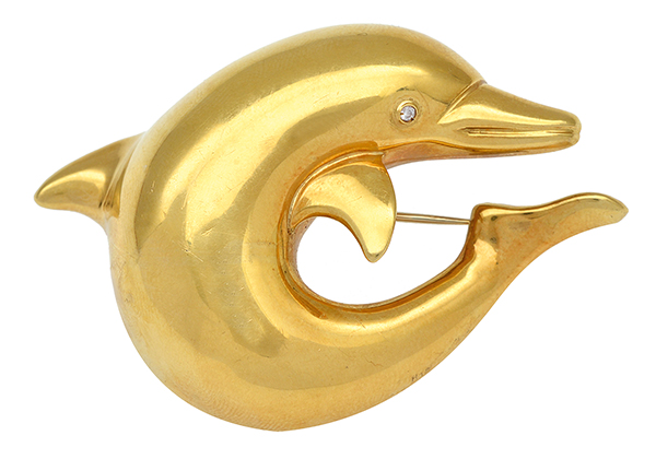 Modelled in a curved formation and having a diamond set eye, mounted in 18ct gold.