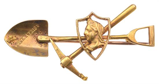 Modelled as a pick and shovel, centred with a shield depicting Queen Victoria in profile, mounted in 18ct gold.