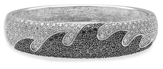 The oval hinged bangle pave set in a wave formation with black and white diamonds, mounted in 14ct white gold.